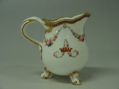 更にシェイプは典型的なロココ・ダブルスクロールハンドルに、膨よかなボディーを支える三つの足と、まるで18世紀のロココセーヴル磁器の様なクリーマーだが、窯印などは一切ない。